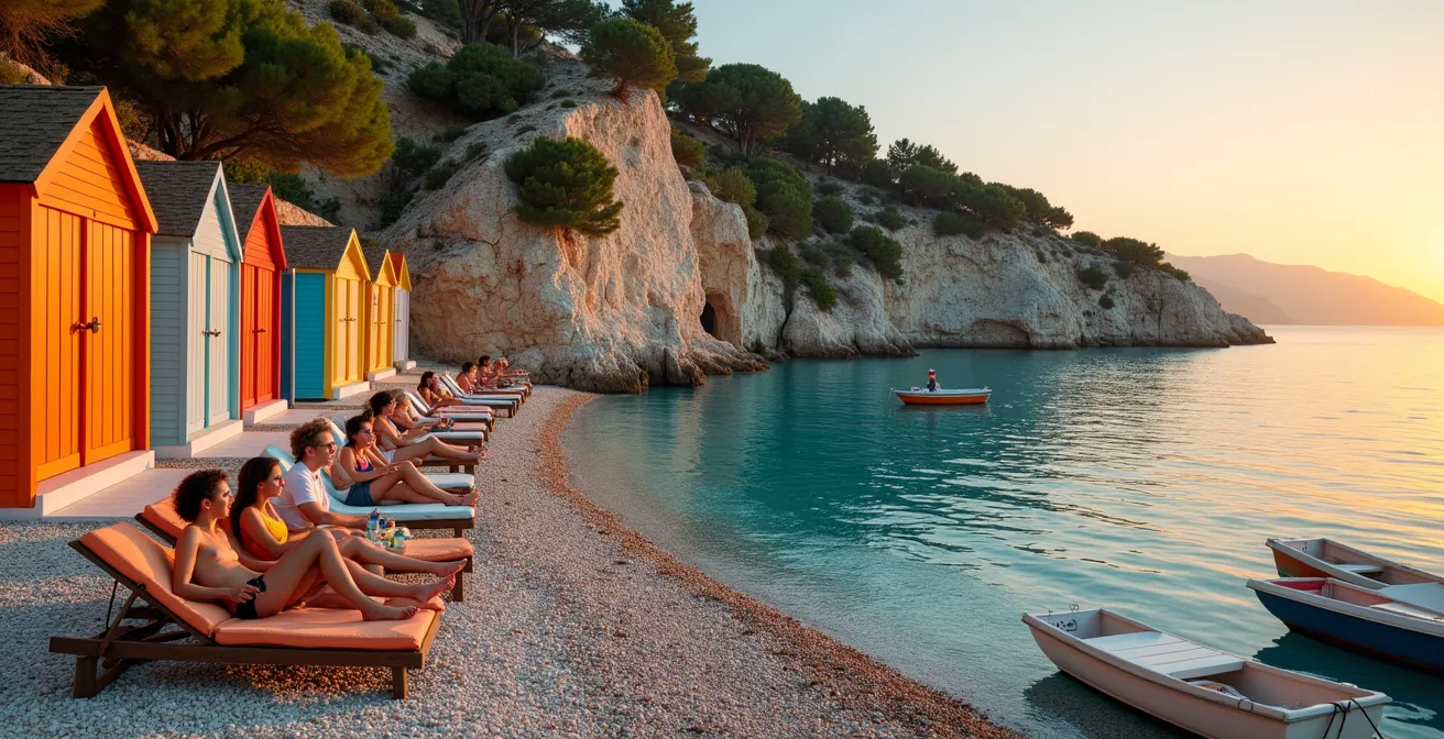 Le premier secret est de bien choisir son emplacement. Ne vous jetez pas sur le premier espace libre. Les connaisseurs savent qu’il existe des zones plus confortables que d’autres. L’astuce ultime ? Cherchez les quelques dalles de béton lisses qui se cachent à l’extrême gauche de l’anse. Elles sont plates, stables et bien plus agréables que les galets. Évidemment, elles sont prises d’assaut. Si elles sont déjà occupées, privilégiez la zone où les galets sont plus fins, près de la mise à l’eau des « pointus », ces barques de pêcheurs traditionnelles.