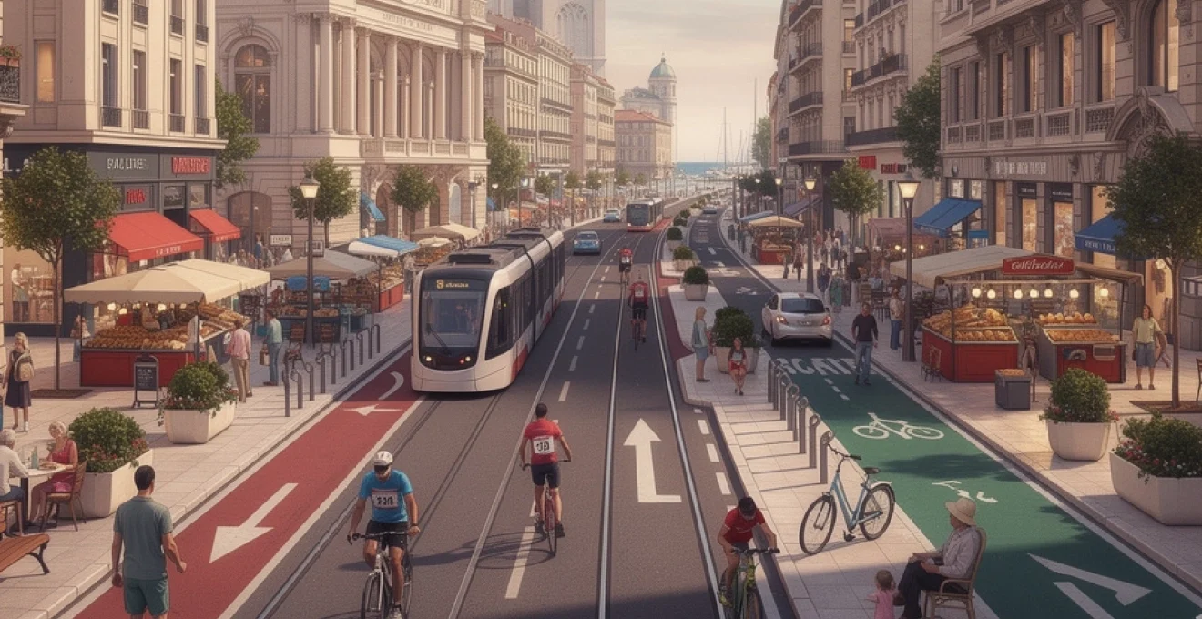 Les réaménagements récents ont cherché à rééquilibrer la place de la voiture au profit des piétons et des mobilités douces. La piétonnisation partielle, la réduction des voies de circulation et la création de larges trottoirs et contre-allées ont progressivement transformé l’expérience de la Canebière. Là où les files de voitures dominaient autrefois, on observe désormais une alternance de zones de déambulation, de terrasses de cafés et de cheminements cyclables. Cette évolution n’est pas sans rappeler le passage d’une autoroute urbaine à un boulevard apaisé.